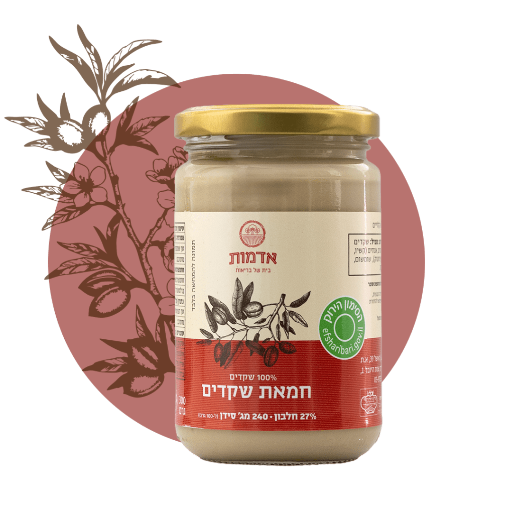 חמאת השקדים של אדמות עשויה מ־100% שקדים טבעיים – ללא תוספת סוכר, ללא חומרים משמרים וללא קלייה